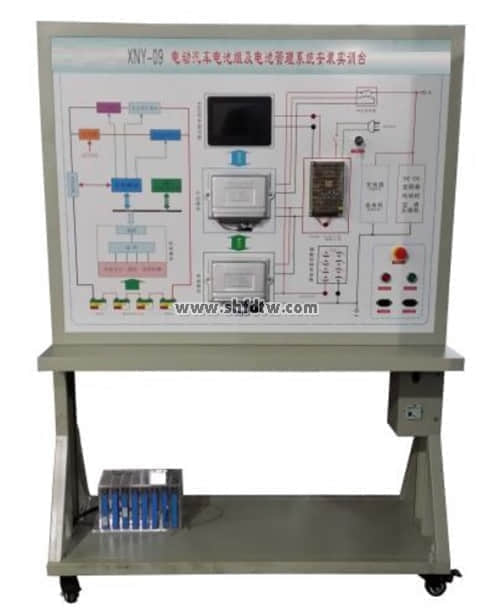 3、實驗臺面板上安裝有電源總開關、BMS電池管理控制單元、7寸BMS信息顯示屏、急停開關、點動開關、12V開關電源、充放電插座、電源檢測端子等,可直接在面板上檢測電源控制單元電信號,如電阻、電壓、電流、頻率信號等。