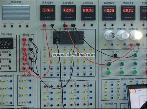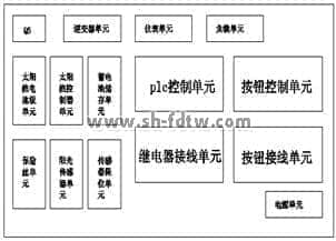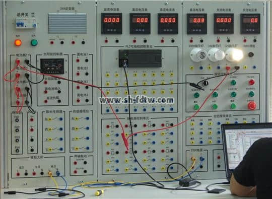 光伏發(fā)電控制監(jiān)控系統(tǒng)由電池板單元、太陽能控制器單元、蓄電池單元、保險(xiǎn)單元、陽光傳感器、傳感器限位單元、模擬太陽單元、兩軸聯(lián)動(dòng)單元、plc控制單元、繼電器單元、按鈕及按鈕接線單元、和相應(yīng)的逆變器儀表電源組成。光伏發(fā)電控制監(jiān)控系統(tǒng)采用接插線的形式進(jìn)行接線,方便學(xué)生自行設(shè)計(jì)實(shí)訓(xùn)。