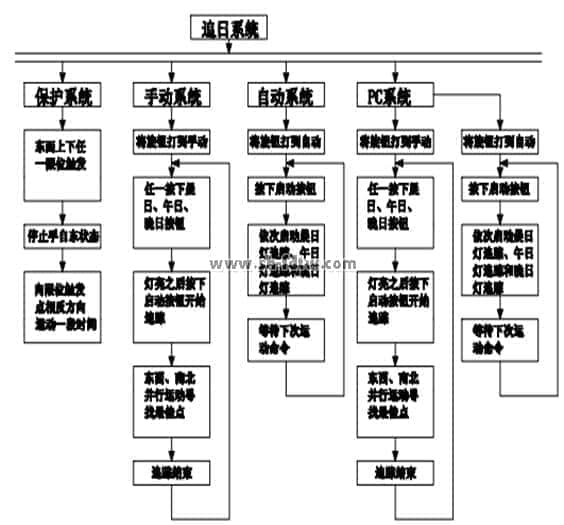 追日系統(tǒng)是由plc程序控制光源模擬跟蹤裝置運(yùn)行,追日流程圖如圖3-3所示: