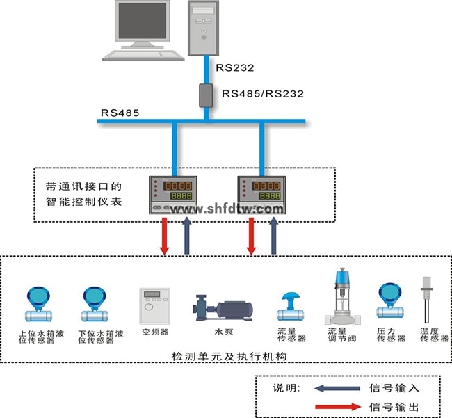 儀表控制系統(tǒng)核心為帶通信功能的各種儀表,儀表內(nèi)集成了各種算法,根據(jù)現(xiàn)場情況整定儀表控制算法的各種參數(shù),達到控制效果。同時帶通訊功能的儀表與上位計算機的軟件平臺通訊。儀表各種參數(shù)和過程值進入軟件平臺(一般為工控組態(tài)軟件)的數(shù)據(jù)庫,再加上組態(tài)的流程畫面和操作界面,可以方便在上位計算機整定參數(shù),對過程值進行記錄分析。