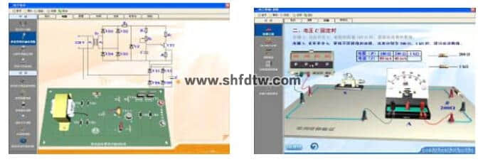 模擬電子技術(shù)包括射極偏置電路、基本放大電路、延時(shí)開關(guān)電路、RC震蕩電路、橋式整流電路、串聯(lián)穩(wěn)壓電路、直流電動(dòng)機(jī)調(diào)速電路、調(diào)光臺(tái)燈、運(yùn)放輸出功能擴(kuò)展等至少9個(gè)實(shí)訓(xùn)項(xiàng)目;根據(jù)相應(yīng)的教學(xué)大綱,要求軟件能基本涵蓋所有的電子技術(shù);教學(xué)任務(wù)需包括目的、電路、原理、布局、接線、仿真和排故等。用文字、圖片的形式展示學(xué)習(xí)目的,將主要掌握的知識(shí)點(diǎn)予以概括,了解本模塊主要的學(xué)習(xí)內(nèi)容包括原理、接線、故障原因及排除故障等;電氣電路與電路實(shí)物相互對(duì)比,當(dāng)鼠標(biāo)指向電氣圖某個(gè)器件時(shí),相對(duì)應(yīng)的實(shí)物也會(huì)放大顯現(xiàn);動(dòng)畫與配音結(jié)合,描述電路組成。原理動(dòng)畫應(yīng)包括兩部分:一是電路組成,以二維動(dòng)畫的形式表現(xiàn)并配有語音講解;一是工作原理,通過語音及二維動(dòng)畫的演示描述其工作過程。當(dāng)前部分要求以高亮顯示。整個(gè)動(dòng)畫要求流暢。同時(shí)動(dòng)畫設(shè)有播放器,通過進(jìn)度條來控制動(dòng)畫進(jìn)度,以達(dá)到學(xué)習(xí)者反復(fù)學(xué)習(xí)觀看的目的;布局要求將器件庫中在實(shí)訓(xùn)過程所需的元件拖動(dòng)放到配電柜中進(jìn)行布局,并設(shè)定故障現(xiàn)象,通過儀器儀表來測(cè)量找到故障點(diǎn),最后分析故障原因,設(shè)置原理圖,協(xié)助操作者了解相應(yīng)原理,繼而分析故障原因、列出查找方法,通過儀器儀表找到故障點(diǎn),最后判定故障結(jié)果。