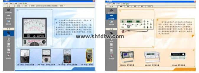 儀器儀表需包括指針式萬用表、數(shù)字式萬用表、普通示波器、信號(hào)發(fā)生器、直流穩(wěn)壓電源、毫伏表、高頻信號(hào)發(fā)生器、鉗形電流表等至少8個(gè)實(shí)訓(xùn)項(xiàng)目;每個(gè)實(shí)訓(xùn)項(xiàng)目中,根據(jù)不同內(nèi)容的教學(xué)大綱要求,需包含各種儀器儀表的外形、面板、使用操作、考考你等不少于3個(gè)實(shí)訓(xùn)任務(wù),其中,數(shù)字式萬用表實(shí)訓(xùn)任務(wù)需包括外形、面板、測(cè)電阻、測(cè)電壓(交、直流)、測(cè)電流、測(cè)二極管、測(cè)三極管、考考你;示波器項(xiàng)目中,當(dāng)鼠標(biāo)滑過面板上對(duì)應(yīng)聚焦、亮度、旋鈕等,對(duì)該部分作用均有文字描述顯示。考考你實(shí)訓(xùn)項(xiàng)目,要求趣味性答題,運(yùn)用游戲一樣的模式,對(duì)正確與錯(cuò)誤和時(shí)間的使用需做出記錄。