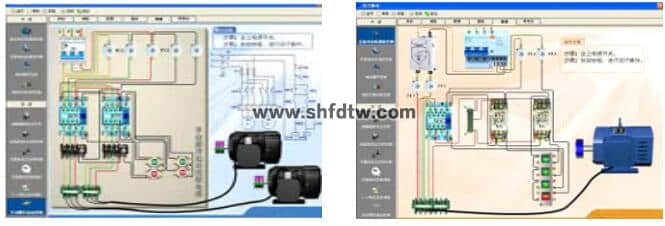 學(xué)員可以操作空氣開關(guān),按鈕等元器件來操控相應(yīng)項(xiàng)目的電路。界面上的接觸器、時(shí)間繼電器等元器件就可以根據(jù)操作控制電機(jī)的轉(zhuǎn)動(dòng)。