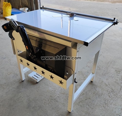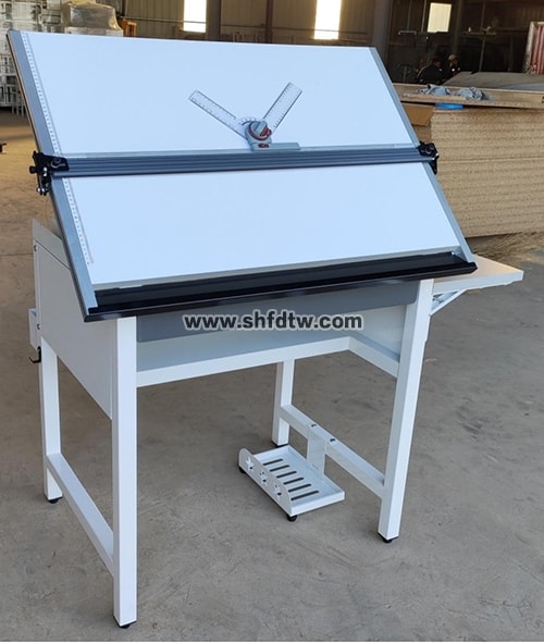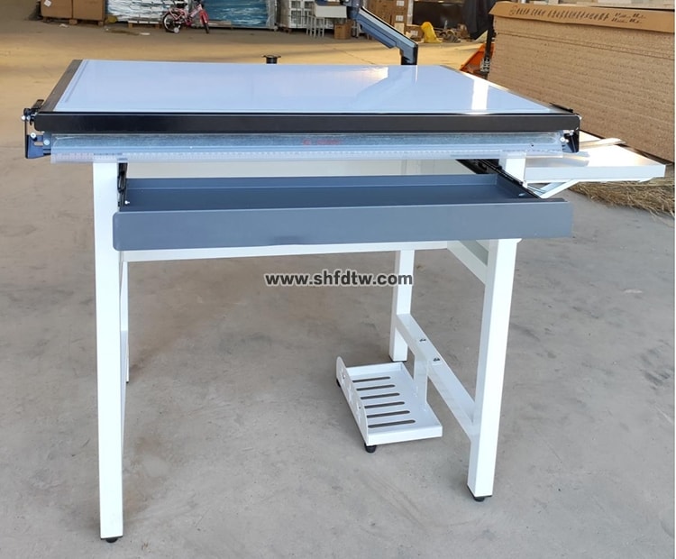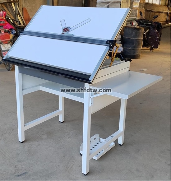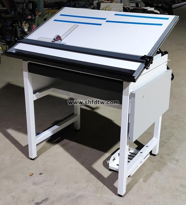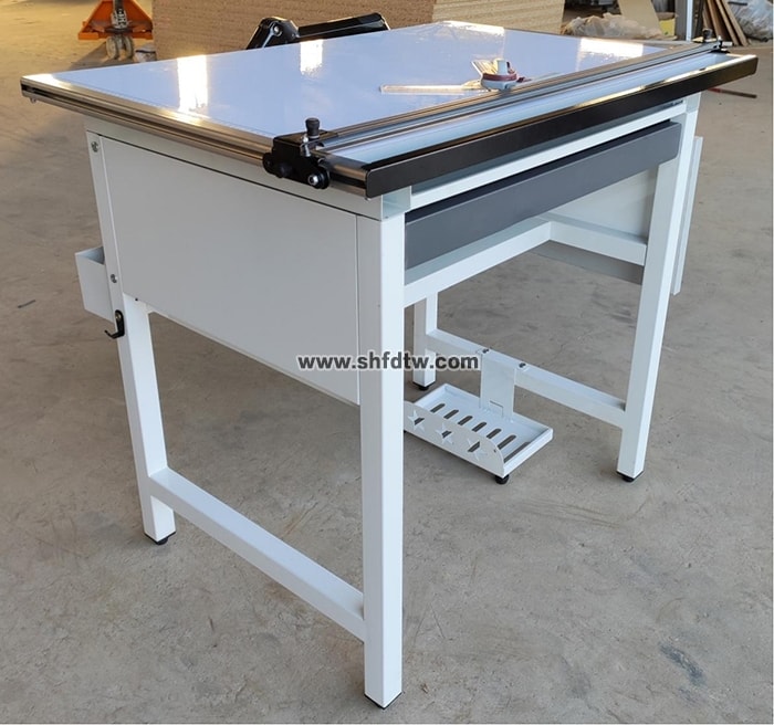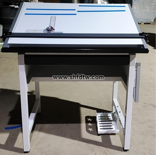 (2)繪圖板基板材質(zhì)為E0級(jí)國(guó)際通用刨花板,正面敷以白色磁性PVC塑膠板面,背面以太白色0.35mm通用PVC器膜,四周采用1mm白色塑料條封邊,檢圖板正面配以不銹鋼壓紙條,在板面上可繪制不同規(guī)格的圖紙。