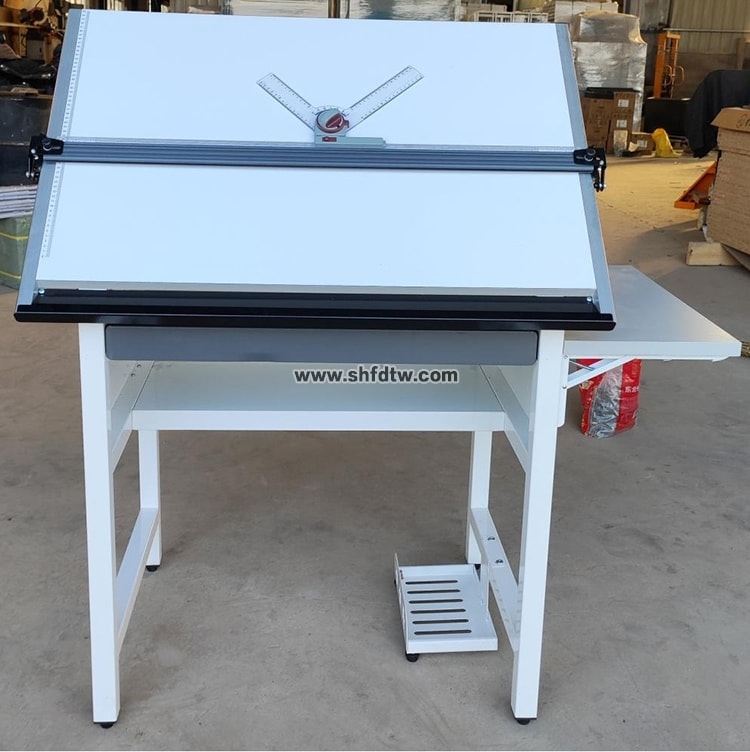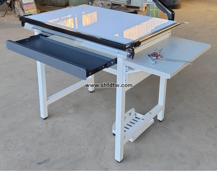 (1)鋁合金磁面繪圖板由磁面繪圖板及壓紙條、鋁金導(dǎo)軌及自潤(rùn)滑滑輪組、鎖緊組件、調(diào)節(jié)支架、鋁合金亞力克復(fù)合直尺、角度調(diào)整旋鈕,鋁合金筆槽等組成。