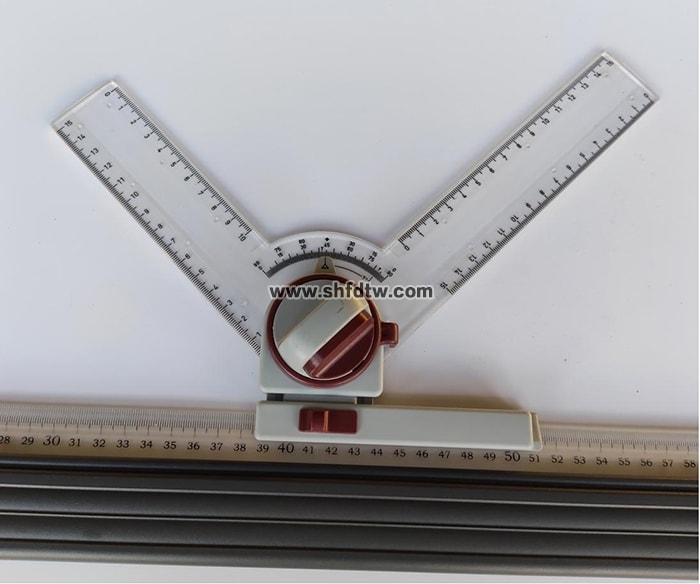 (3)兩側(cè)安裝輕型鋁合金導(dǎo)軌,鋁合金導(dǎo)軌內(nèi)均安裝有自潤(rùn)滑滑輪組并以柔性不銹鋼絲相連接,鋁合金導(dǎo)軌兩端安裝有封蓋,右側(cè)滑輪組設(shè)置一個(gè)功能旋鈕,松開后可以使直尺傾料土20°,以繪制一些特殊斜線。