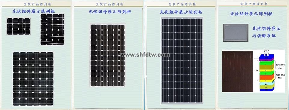 1.設(shè)備組成:(1)太陽(yáng)能光伏硅材料展示柜;(2)太陽(yáng)能光伏電池片展示柜;(3)太陽(yáng)能光伏組件展示臺(tái);(4)太陽(yáng)能光伏組件附屬材料展示柜;(5)太陽(yáng)能光伏應(yīng)用產(chǎn)品展示柜.