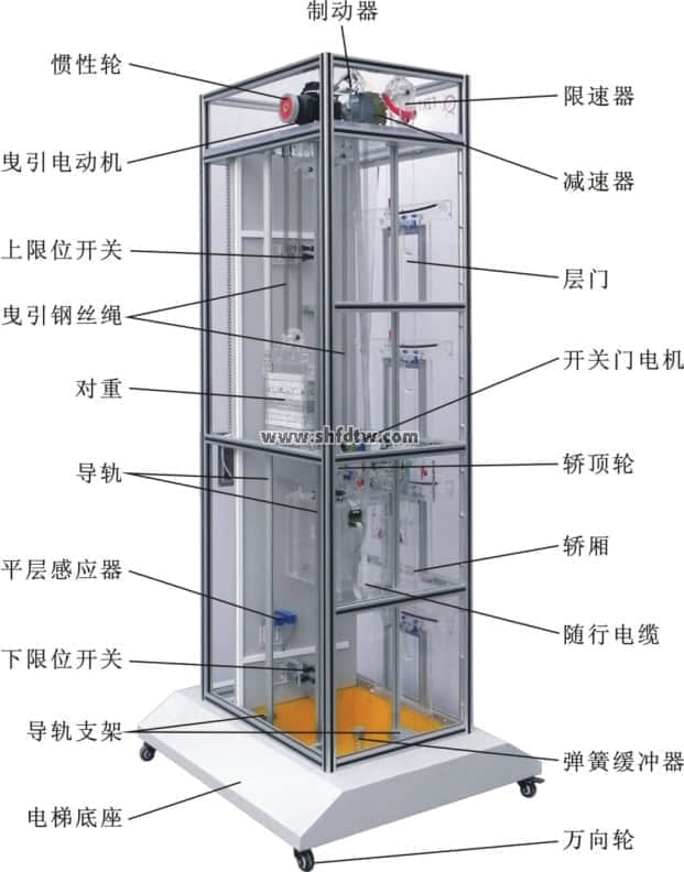 電梯是根據(jù)最常見的升降式電梯結(jié)構(gòu),采用透明有機(jī)材料制成,其結(jié)構(gòu)與實(shí)際電梯完全相同,且?guī)缀蹙邆淞藢?shí)際電梯的所有功能。事實(shí)上可以把它看作是小型化了的真實(shí)電梯。為了便于教學(xué),電梯大部分部件均是采用透明有機(jī)材料制成,使得電梯的內(nèi)部結(jié)構(gòu)一目了然;同時(shí),電梯的運(yùn)行過程,以及每個(gè)動作都十分明了,且可以反復(fù)實(shí)際動手操作。使學(xué)生能夠很直觀、透徹地了解、掌握電梯的結(jié)構(gòu)及其動作原理,達(dá)到事半功倍的效果。解決了以往電梯教學(xué)中單純的理論教學(xué)方式或是參觀實(shí)際電梯時(shí)所帶來的不安全,無法全面了解其內(nèi)部結(jié)構(gòu)及運(yùn)行過程等種種實(shí)際問題。
