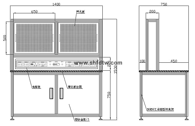 (5)桌架下部設(shè)計木質(zhì)工具柜,二開門設(shè)計,用于放置工具、電氣元件及資料等。外形尺寸約:1300×600×530mm