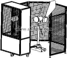 葉片、輪轂、發(fā)電機、機艙、尾舵和側風偏航控制機構組裝成水平軸永磁同步風力發(fā)電機,安裝在塔架上。風場由軸流風機、軸流風機支架、軸流風機框罩、測速儀、測速儀支架、風場運動機構箱體、傳動齒輪鏈機構、單相交流電動機、滾輪和萬向輪等組成。軸流風機和軸流風機框罩安裝在風場運動機構箱體上部,傳動齒輪鏈機構、單相交流電動機、滾輪和萬向輪組成風場運動機構。當風場運動機構中的單相交流電動機旋轉時,傳動齒輪鏈機構帶動滾輪轉動,風場運動機構箱體圍繞風力發(fā)電機的塔架作圓周旋轉運動,當軸流風機輸送可變風量風時,在風力發(fā)電機周圍形成風向和風速可變的風場。